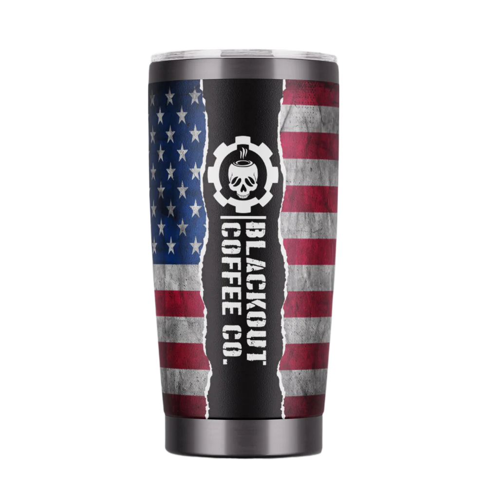 Optimal Insulation Technology that will hold your drink at the temperature you filled the tumbler cup with, for a long period of time. The Blackout Coffee Tumbler is the perfect choice to enjoy your favorite beverage at home, office, event or on the go. Allows for 20 oz of liquids to help you stay hydrated throughout the day or night. Engineered with premium food safe 18/8 stainless steel and double wall vacuum insulated design, that keeps your hot coffee steaming and your cold drinks like ice for many hours. Due to its incredible technology, it wonโ€™t transfer the temperature to the exterior wall, allowing comfortable handling. Whatโ€™s a great tumbler bottle without a great closure? To pair with our outstanding travel tumbler, we added a durable, clear, safe, tight fitted and spill resistant sliding lid, to storage and help keep your drink insulated even longer. Blackout Coffee Tumbler Mug Specs: Double Wall Vacuum Insulated (304) Stainless Steel Construction Sweat Free Design Heavy Duty Clear Lid Tight Fitted Spill Resistant Sliding Lid Blackout Coffee Tumbler Features: Keeps Your Hands Dry Keeps Liquids Ice Cold For Up to 24 Hours Keeps Liquids Hot For Up to 8 Hours Fits Most Cup Holders BPA Free & Eco-Friendly Laser Engraved Blackout Coffee Skull Logo on One Side Laser Engraved US Flag on the Other Side *For best results, hand wash with soap, water and a scratch-free sponge. Towel dry immediately to help preserve decoration. Do not soak or use cleaning materials (bleach, chlorine, etc.) and DO NOT put in dishwasher, freezer or microwave.