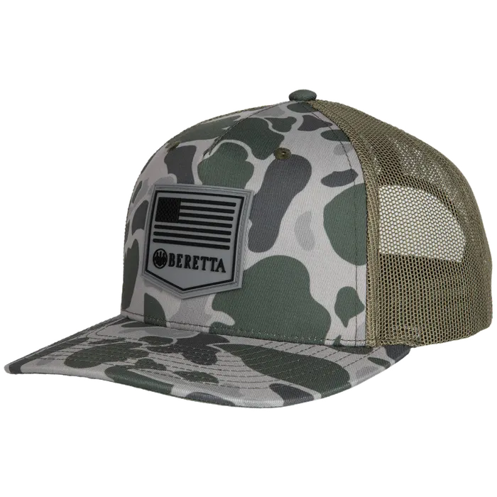 Richardson® trucker hat in Duck Camo with front Beretta flag patch.