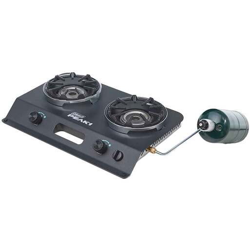 Coleman PEAK1 2-Burner Camping Stove – Elevate your next camping trip with the PEAK1 Collection—premium gear designed to inspire and built for those making the most of the outside. Influenced by up-mountain design, the PEAK1 2-Burner Camping Stove makes it easy to cook great meals outdoors. Because Coleman knows that when you’re on this adventure you’re planning the next one, Coleman made sure the durable cast-iron design is easy to clean. Every bit of space counts when packing, so this portable stove has a slim profile to save you room, as well as a sturdy handle, and a foam case. DESIGNED TO INSPIRE: Premium gear made for making the most of the outside; great for backpacking, hiking, camping, and more PORTABLE: Slim design with minimal setup; foam case with handle is easy to pack and carry EVEN COOKING: Burner uses a stair-stepping design and added flame holes for faster, more even cooking; limited knob rotation makes it easy to control temperature WIND PROTECTION: Pan support provides protection from the wind MATCHLESS LIGHTING: Rotary ignition for easy, matchless lighting; 20,000 total BTUs of cooking power DURABLE: Cast iron holds up for years and is easy to clean 2 ADJUSTABLE BURNERS: Cook up to 2 dishes at the same time MADE TO LAST: 5-year limited warranty BURN TIME: Up to 1 hour on high on one 16 oz. propane cylinder (sold separately)